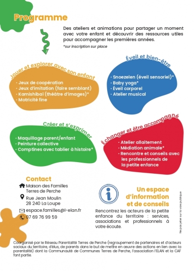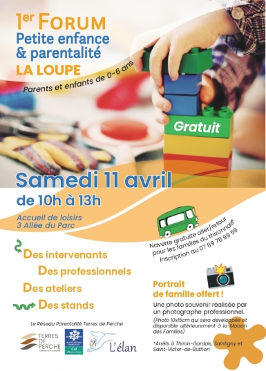 Le 1er Forum Petite Enfance du Réseau Parentalité sur le territoire Terres de Perche aura lieu le Samedi 11 avril de 10h à 13h à l'ALSH de La Loupe.